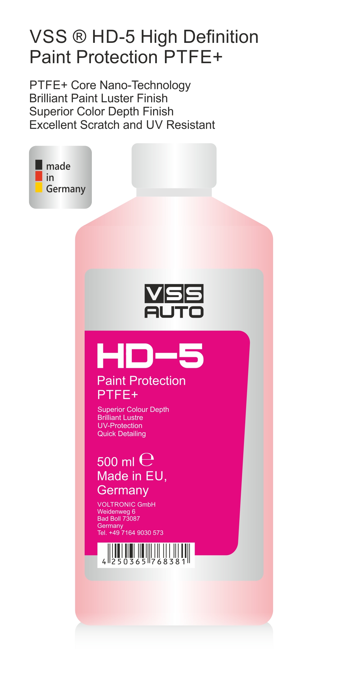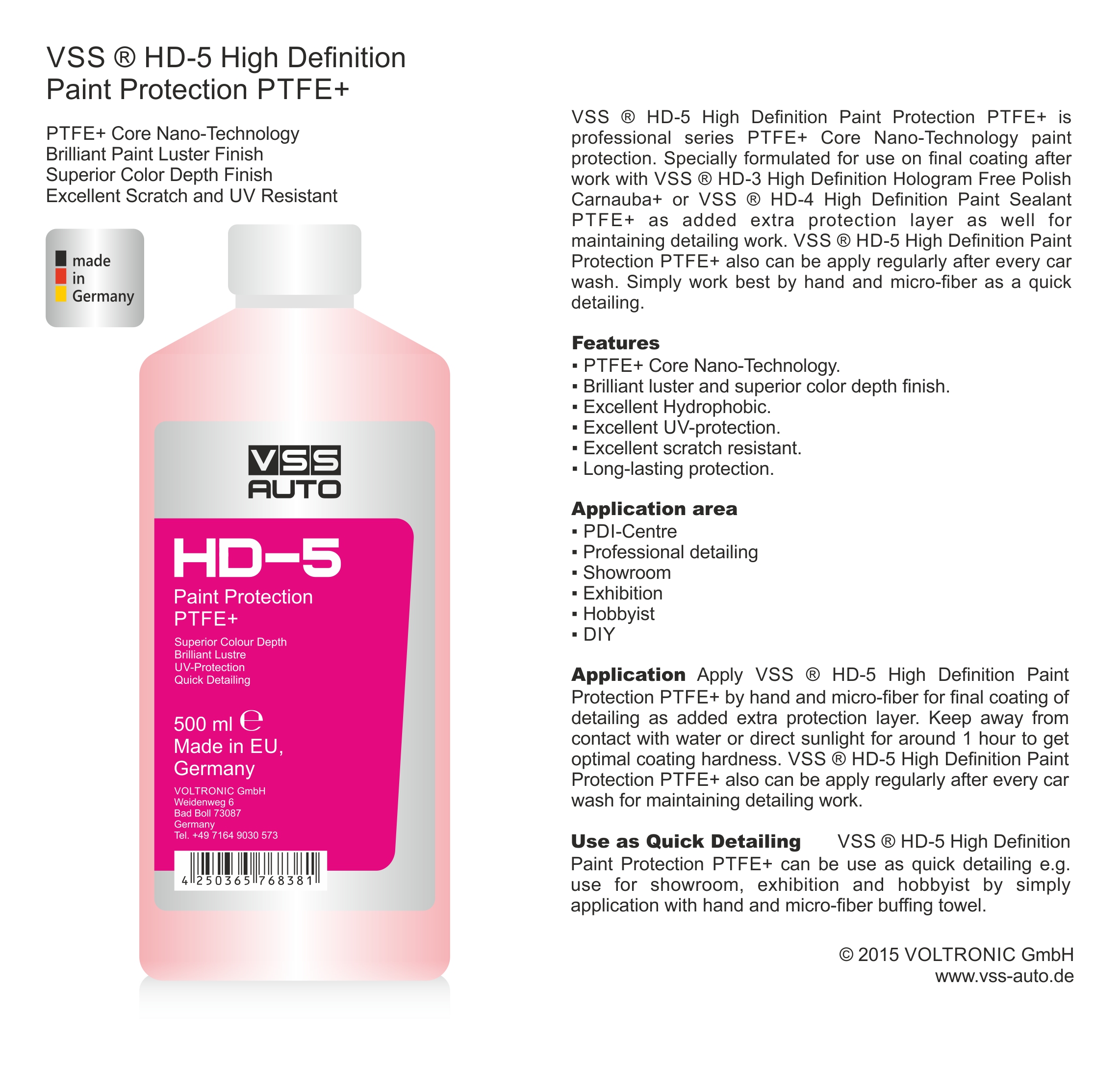 VSS HD-5 High Definition Lackschutz PTFE+ ist Teil einer professionellen Politurserie, eine Nano-Technologie Lackschutz Politur. Speziell hergestellt für den Abschluss nach dem Auftragen von VSS HD-3 High Definition Hologram Free Carnuba+ oder VSS HD-4 High Definition Lackschutz PTFE+ als eine zusätzliche Schutzschicht, sowie zur Auffrischung von Lackaufbereitungen. VSS HD-5 Lackschutz PTFE+ kann nach jeder Autowäsche aufgebracht werden. Zum raschen Auffrischen des Lackes einfach aufsprühen und mit einem Microfasertuch einreiben.